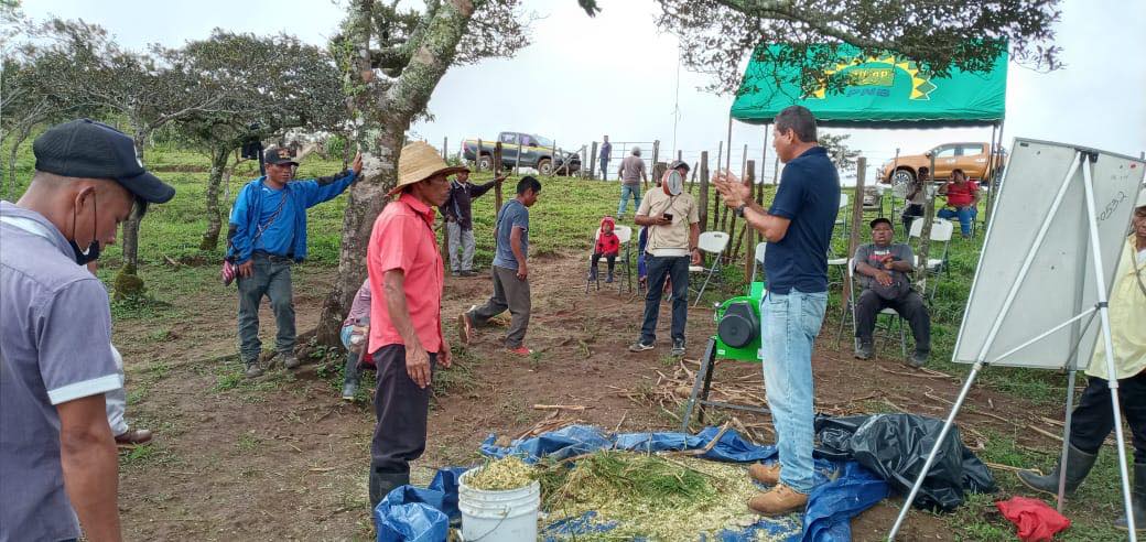 Día de campo con productores beneficiados con toros criollos de la raza guaymí, para ello, se recalcó la importancia de los pastos como principal fuente de alimentación para el ganado, para ello se requieren pastos que suplan las demandas nutricionales del animal para llevar a cabo sus funciones vitales, lo cual depende en gran medida del manejo adecuado del pasto para que pueda expresar su potencial nutricional y por ende al ser consumido por el animal, aporte los nutrientes necesarios para el crecimiento, desarrollo, producción y reproducción; también se incluyó la importancia de las pasturas a utilizar, ya que depende de muchos factores para que se adapten alguno de ellos son: la zona, altura, precipitación, tipos de suelos, densidad de siembra, tolerancia a plagas y enfermedades, entre otros.